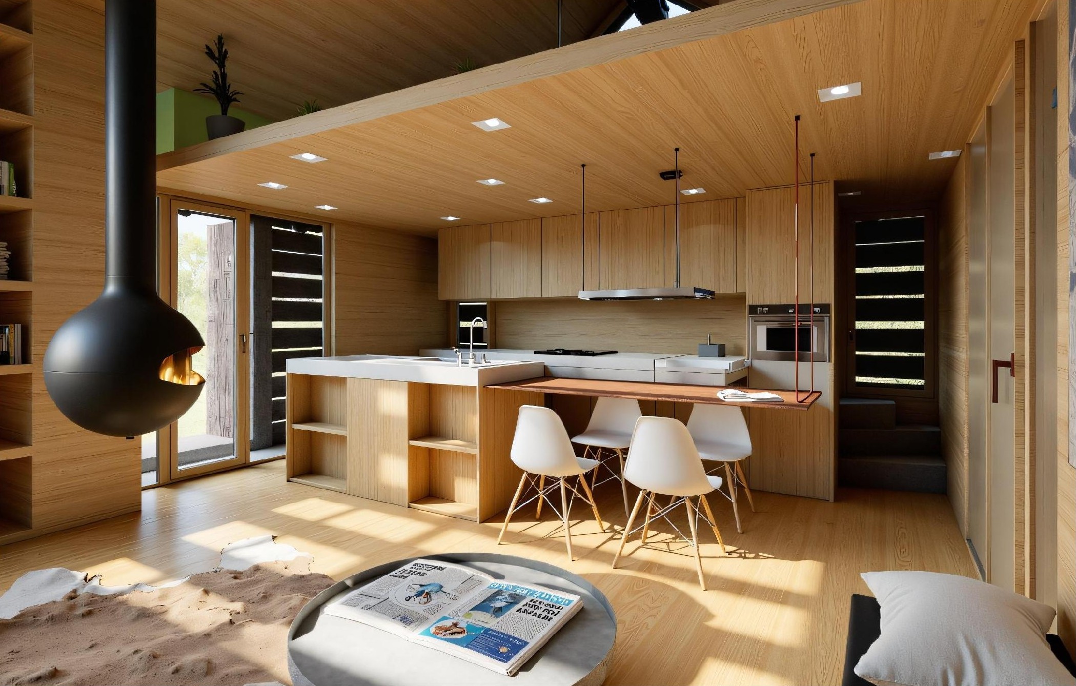 Zwischengeschoss: offener Raum mit Eingangshalle, Küche, Esszimmer und Wohnzimmer.