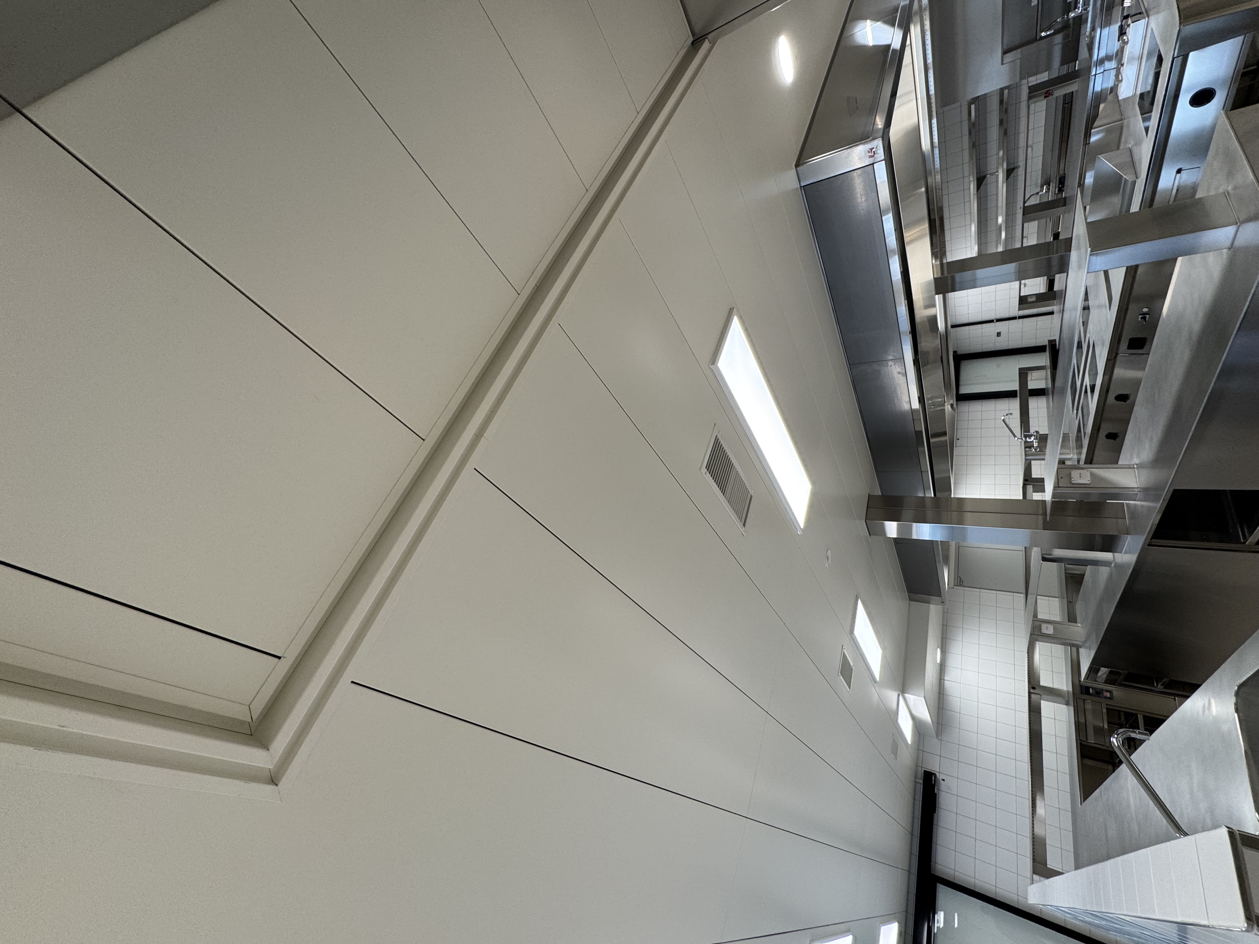 Dans cette cuisine professionnelle, nous avons mis en œuvre un faux-plafond en bacs métalliques lisses, spécialement conçu pour répondre aux exigences élevées des environnements techniques et alimentaires.