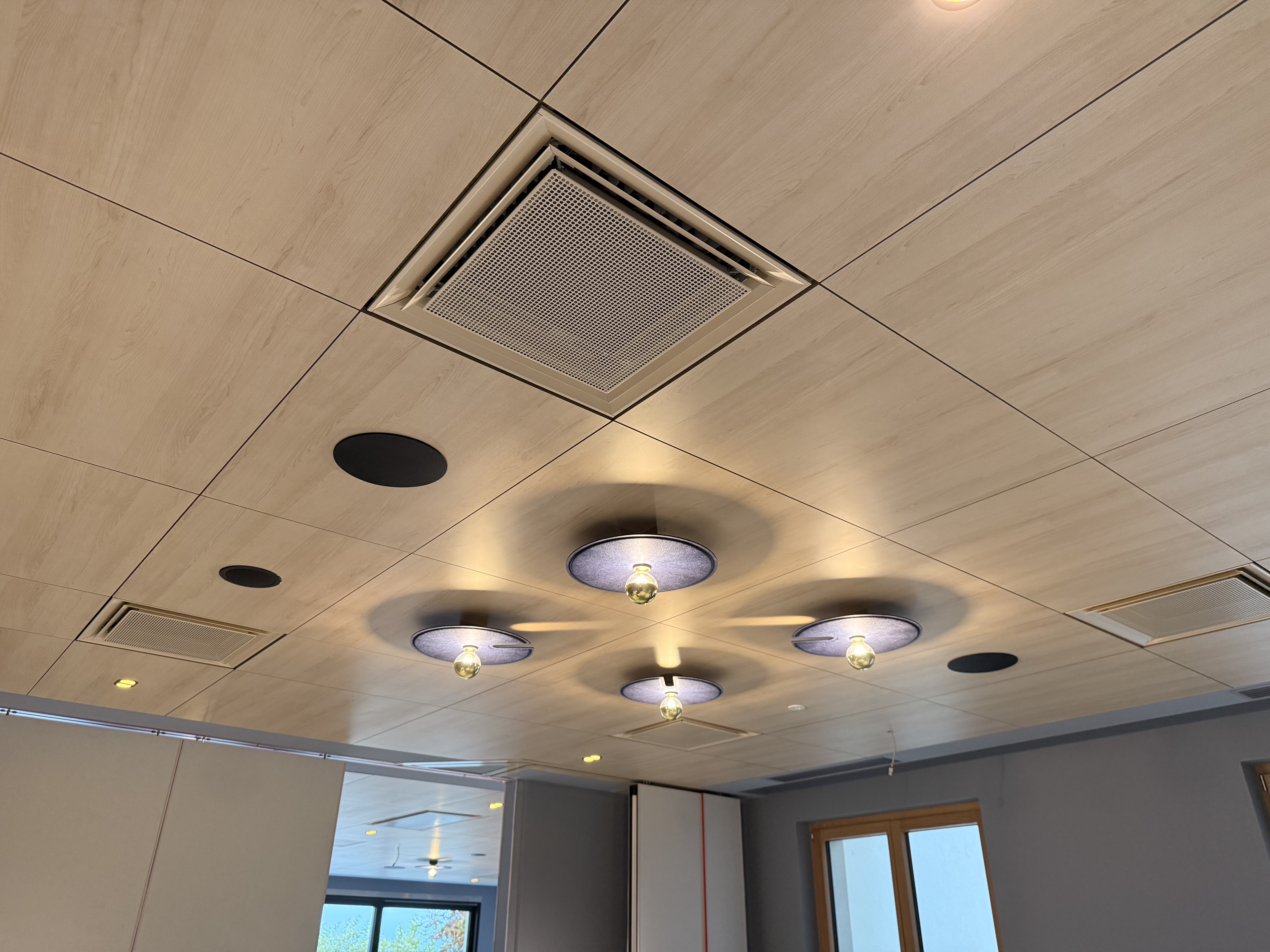 Le faux-plafond permet également une intégration précise et fonctionnelle des équipements techniques (éclairage, ventilation, sprinklers), tout en assurant un rendu sobre et professionnel.