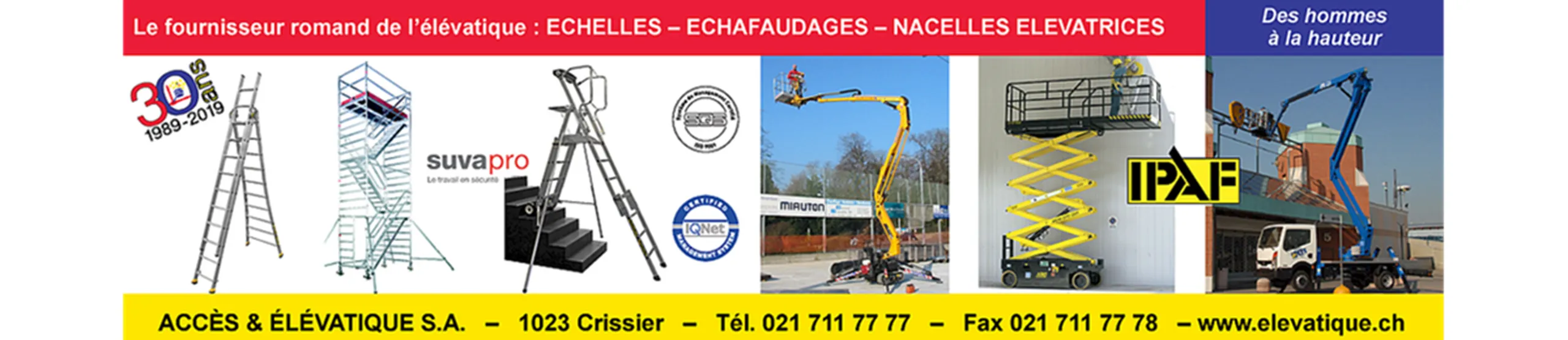 Based in Crissier - Lausanne since 1989 and with experience recognized by all professionals, Accès & Elévatique SA, a specialist in lifting personnel, is able to meet all your requirements for working at height for the maintenance, construction, and renovation of buildings, industry, logistics, electrical installations, and outdoor facilities.