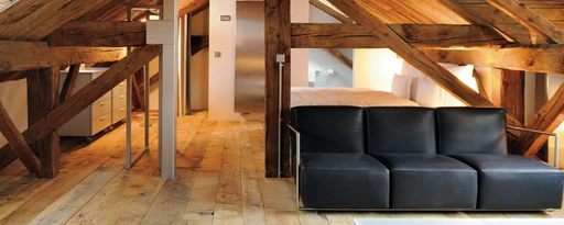 The interior design is a gem of simple elegance. White base tones coordinated with light wood convey warmth and life. Polished limestone from Burgundy combined with light wood floors also contribute to the distinctive atmosphere. In keeping with the motto "old becomes new," the entrance area was laid with slabs from a venerable stone roof.