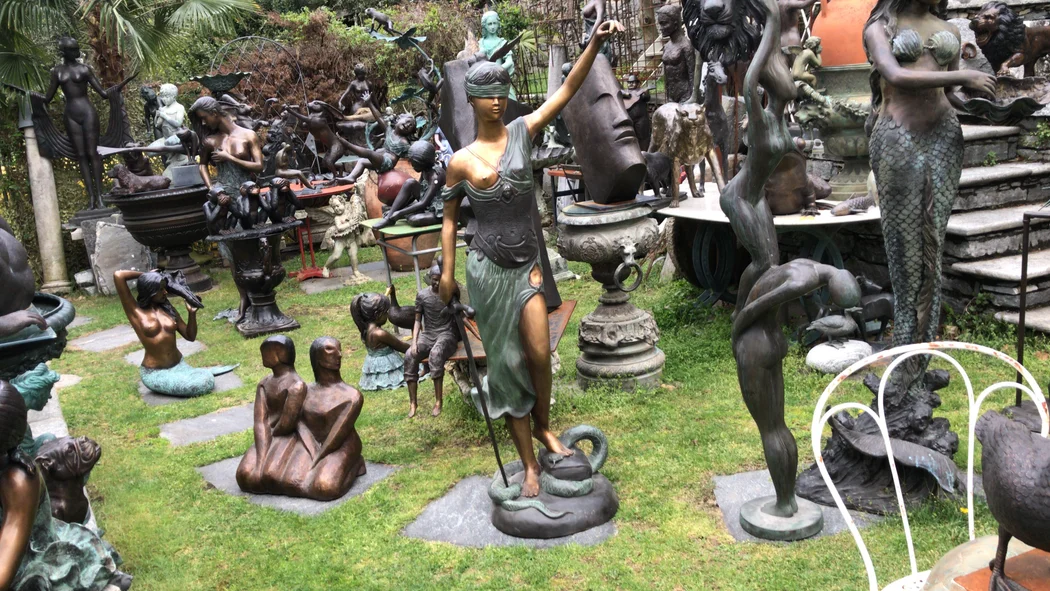 Buddha figures, monks, ganesch, oriental furniture, tribal masks, sacred art, paintings with biblical scenes, madonnas, crucifixes, saints, various fragments, furniture from the 1700s from Ticino, Italy, France, Murano chandeliers, paintings and modern art.